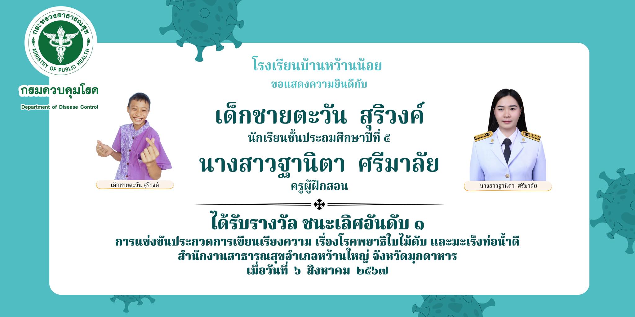 ขอแสดงความยินดีกับ คุณครูฐานิตา ศรีมาลัย และ เด็กชายตะวัน สุริวงค์ ที่ได้รับรางวัลชนะเลิศอันดับ 1 กา...